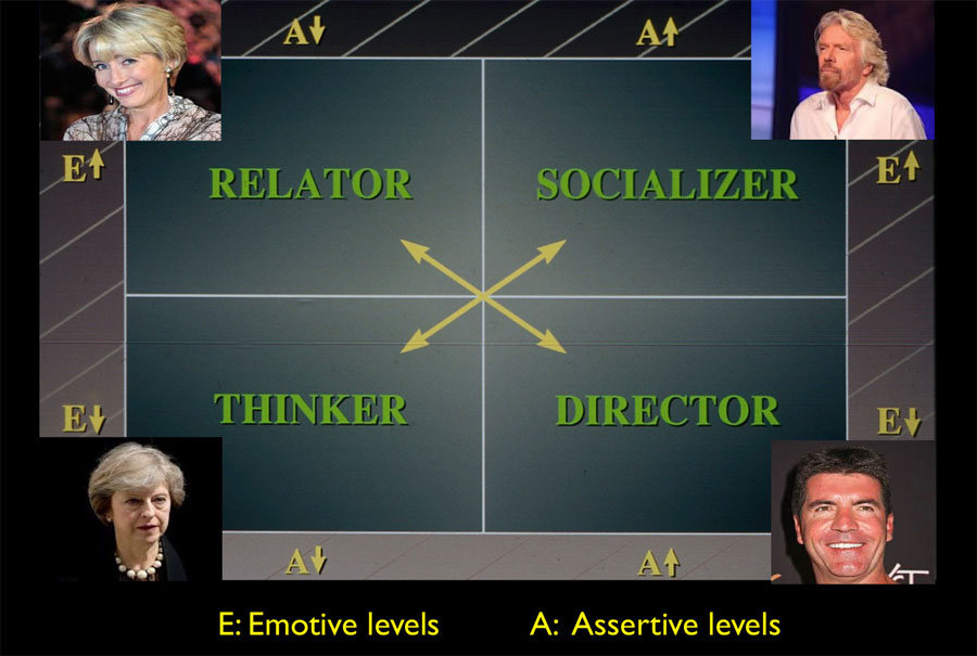 The author has for many years taught ‘personality profiling’ (as named by Dr Tony Allesandra) and simplified it down to a basic set of four personality types defined by their emotive/openness levels (E) and their assertive/ directness levels (A).
