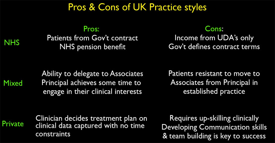 The positive and negatives of the three types of practice are summarised in Figure 6, indicating an increasing level of stress related to traditional NHS practices and an improvement in the dentist’s quality of life in the private practice model due to regaining control of their time available related to the delivery of care in a ‘user pays’ environment.